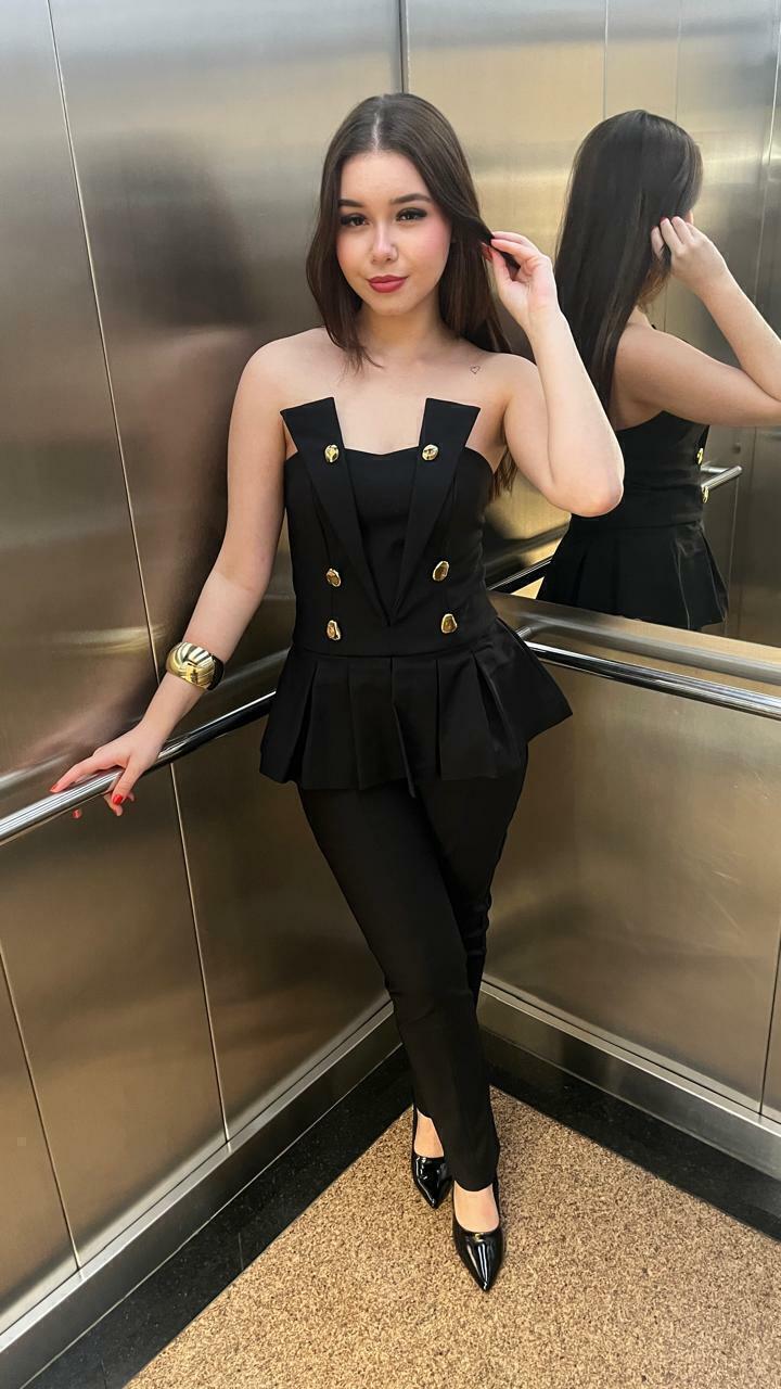 CONJUNTO CORSET PEPLUN BOTOES E CALCA AJUSTADA PRETO.