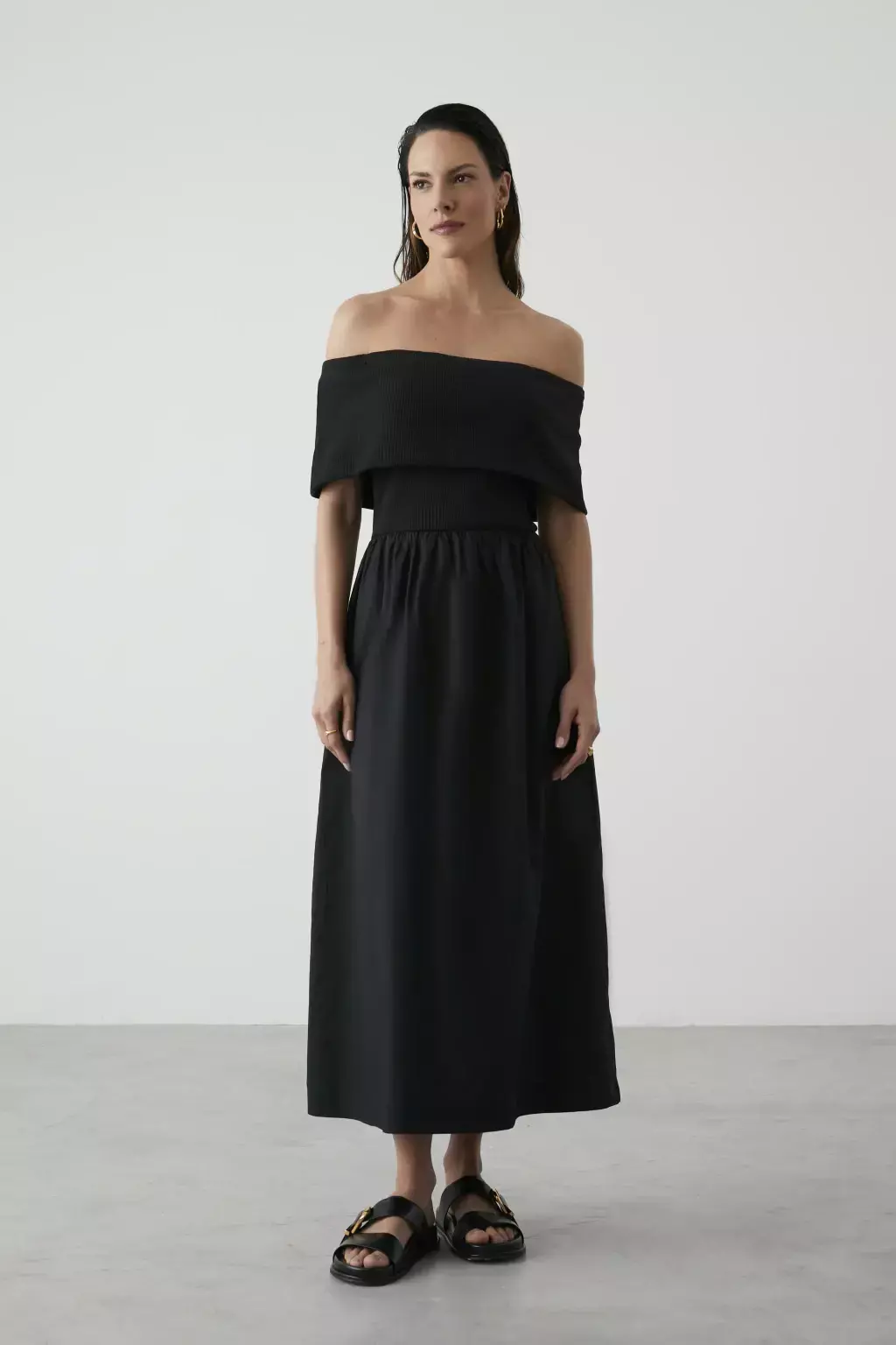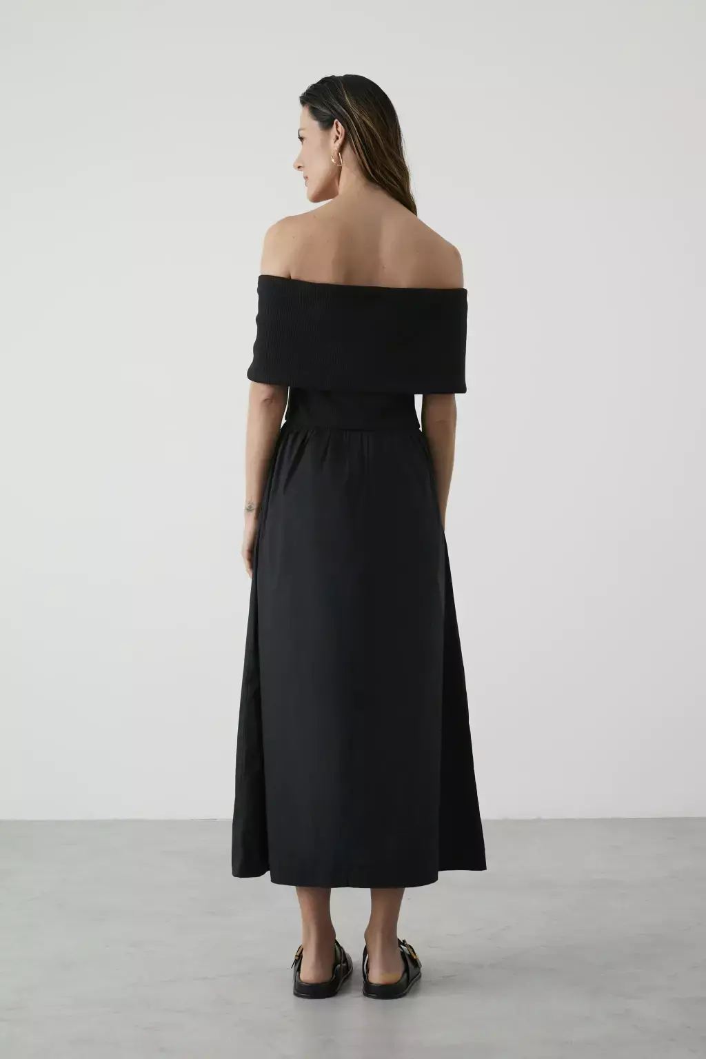 Vestido Cláudia Preto, ideal para quem busca sofisticação e conforto. O busto em malha canelada valoriza o decote ombro a ombro com detalhe de pala delicada. A saia mídi em tricoline, com pregas suaves na cintura, proporciona movimento elegante. Bolsos laterais completam a praticidade desse look atemporal. Perfeito para diversas ocasiões!